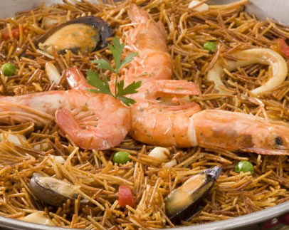 Place the pan on the fire with oil when hot fry the chopped cuttlefish until golden; then fry the garlic, paprika, parsley, and tomatoes all chopped; stir well and add the broth. After starting the boil add the noodles, meat monkfish and clams. Bring to a boil over high heat around for 10 to 12 minutes. Then 10 minutes over low heat until dry. For more delicacy of this dish can also add crawfish and shrimp, and even lobsters and prawns.